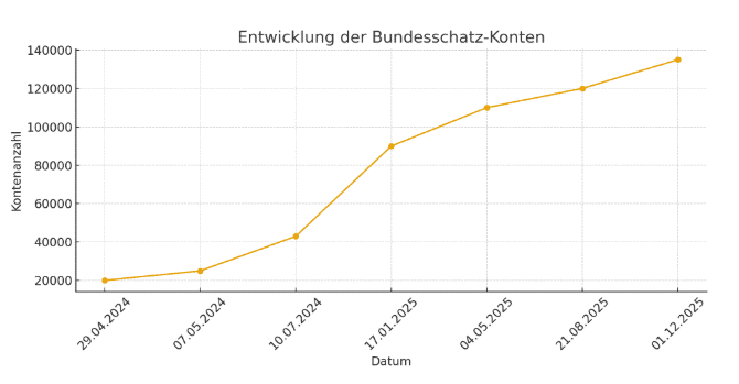 Seit dem Start im Frühjahr 2024 steigen die Kundenzahlen kontinuierlich. In den ersten Wochen lag die Kontenzahl im fünfstelligen Bereich, zum Jahreswechsel 2024 auf 2025 wurde bereits die Marke von rund 100.000 eröffneten Konten übertroffen. Die im Juni 2025 erfolgte Öffnung des Produkts für öffentliche Einheiten führte zu einem weiteren deutlichen Anstieg. Mittlerweile nutzen mehr als 135.000 Personen und Institutionen den Bundesschatz.